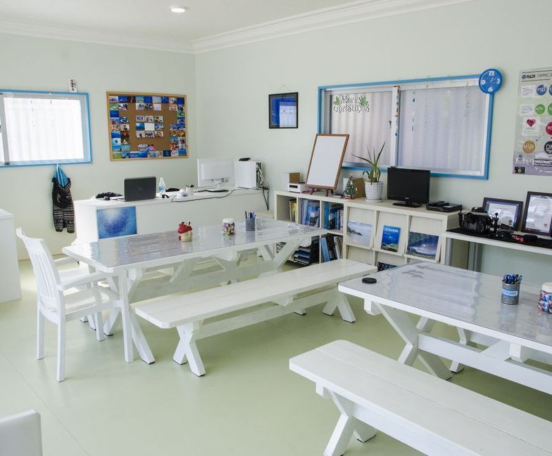 ワールドダイビングのライセンス講習は、学科とプール実習、それに海洋実習を組み合わせた標準的な流れで行われます。